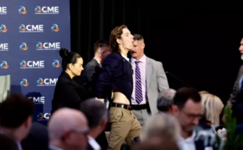 The protesters stormed the stage, shouting slogans and displaying banners reading "Disrupt Burrup hub," which were quickly torn down by event staff. Security personnel intervened, escorting the individuals out of the venue. Among the protesters were a person wearing a green anorak and another in a black hoodie. Music was turned up in an attempt to drown out the commotion.