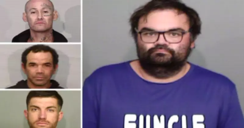 The four alleged offenders range in age from 31 to 45 years old. Warrants have been issued for their arrest, and police have provided information about their known frequent locations.