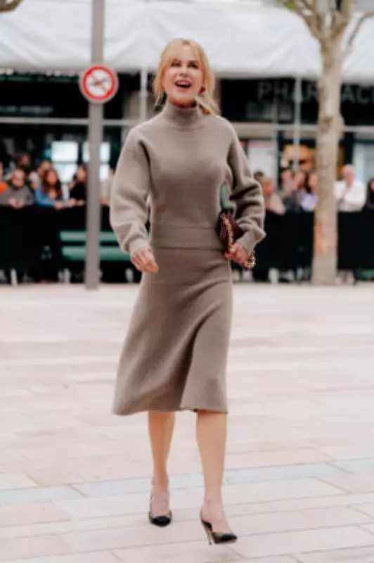 Hollywood A-lister Nicole Kidman looked chic as ever while rugging up for a ritzy Chanel dinner in France yesterday. The Australian actress, who is a brand ambassador for the luxury fashion label, donned a matching mousy brown knit jumper and midi skirt for the event in Biarritz, and was all smiles as she arrived.